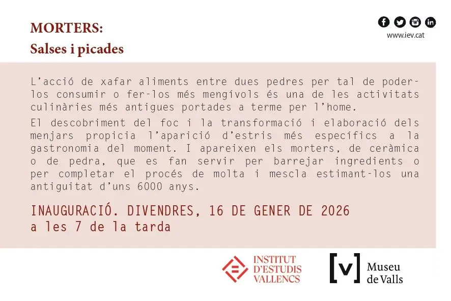 L'Institut d'Estudis Vallencs en coordinació amb el Museu de Valls han creat una nova exposició temporal sobre com ha afectat a l'evolució d'estris culinaris (en concret, els morters) sobre el plaer gustatiu en la població.